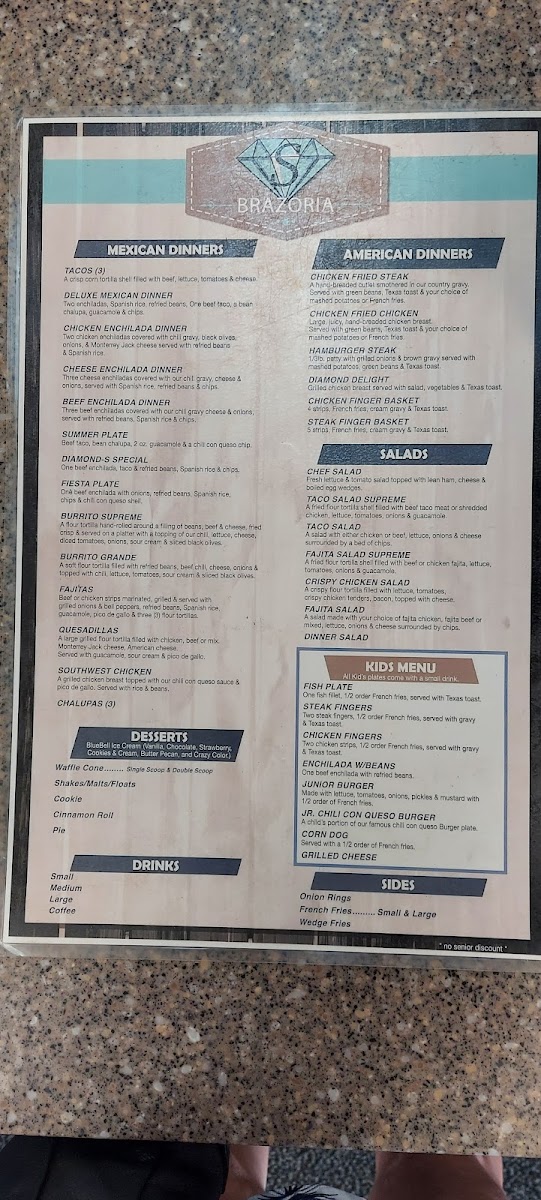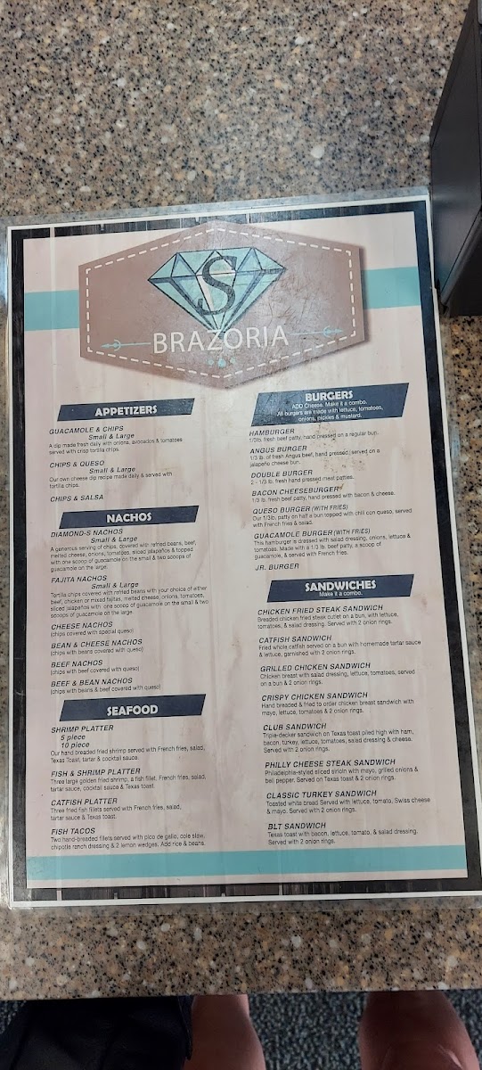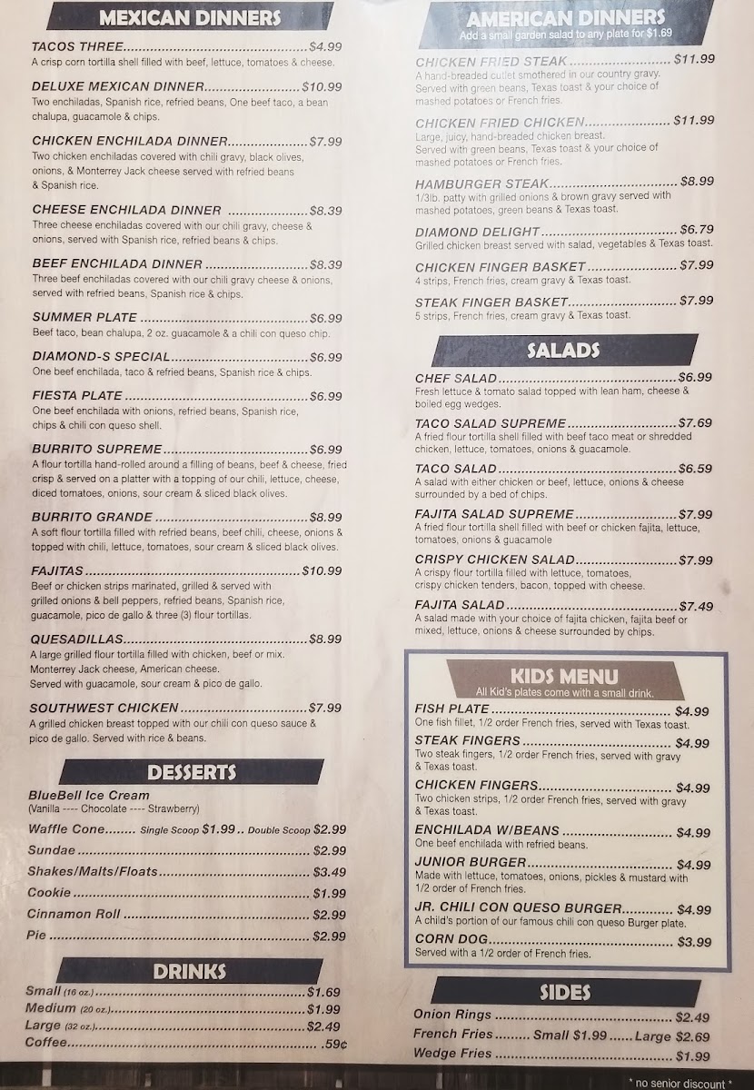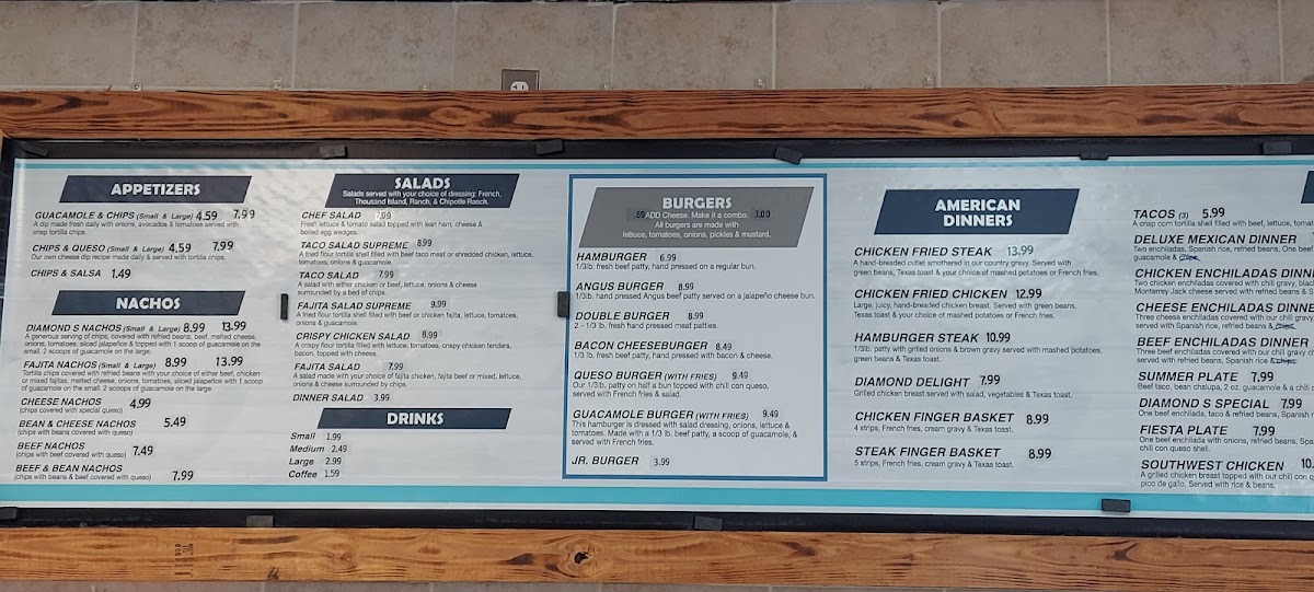 You’ll find hearty options like the Chicken Fried Steak with Mashed Potatoes and Gravy, alongside lighter choices such as the Chef Salad or Taco Salad Supreme. For those in the mood for satisfying, shareable plates, Diamond S Nachos and Onion Rings offer simple pleasures that pair well with good company and easy conversation. Seafood lovers can enjoy the Shrimp or Catfish Platters, while burger fans have several satisfying takes including the Guacamole Burger or the traditional Bacon Cheeseburger.